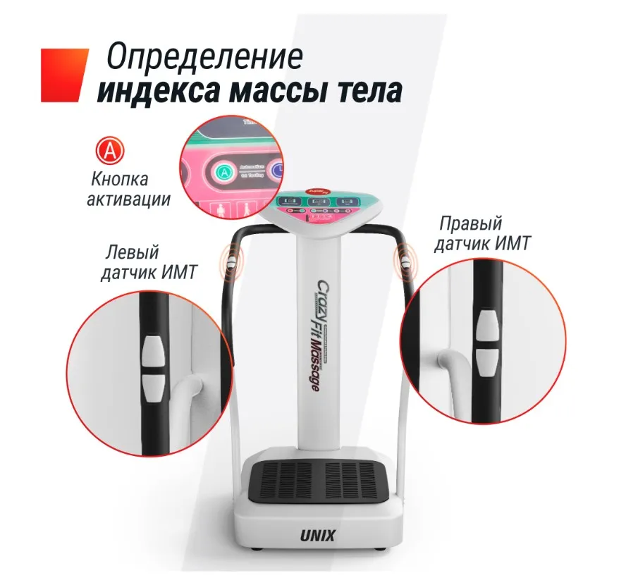 Виброплатформа горизонтальная UNIX Fit Improve 2 in 1 (серебристый)Вибрационная платформа UNIX Fit Improve 2в1 Silver с консолью и поручнями предназначена для людей, желающих повысить свою физическую активность и оздоровить организм. Это современное устройство, обладающее удобством в использовании и новейшими технологиями, станет отличным помощником как для начинающих, так и для профессиональных атлетов. С мощностью двигателя 1,5 л.с. и системой защиты от перегрузок, эта платформа позволяет достигать значительных результатов всего за 15-20 минут тренировок в день. Высокочастотные вибрации способствуют активному сокращению мышц, что ведет к их укреплению и улучшению общего тонуса. Поддерживающие поручни на платформе играют важную роль, особенно для новичков и людей, восстанавливающихся после травм, предоставляя им дополнительную опору во время занятий. Это позволяет пользователям чувствовать себя уверенно и сосредоточиться на выполнении упражнений. Тренажер оснащен консолью с тремя индикаторами, которые показывают время тренировки, скорость вибрации и имеют кнопки для запуска и остановки устройства. Виброплатформа для похудения предлагает различные режимы работы и может выдерживать пользователей весом до 150 кг. Кроме того, высоту ножек можно отрегулировать для удобства использования. С каждой стороны поручней расположены датчики для измерения ИМТ. Чтобы активировать устройство, сначала нужно четыре раза нажать на кнопку "Авто" до появления "1". Затем, с помощью кнопки "таймер", выберите пол: "1" для женщин и "2" для мужчин, изменяя значения кнопками "+" и "-". После этого снова нажмите "таймер", чтобы ввести данные о возрасте, затем - для роста и веса. Завершите процесс нажатия кнопки "таймер", после чего положите руки на рукоятки; на экране отобразится ваш ИМТ.